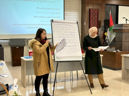 The workshop was led by Dr. Essam Abidin, an expert in legal and human rights affairs. The aim of the workshop was to enhance participants' knowledge of key concepts related to disability and persons with disabilities, to understand the reality of the rights of persons with disabilities in relation to local governance, identify major gaps in the rights system, and deepen participants' understanding of the system of rights for persons with disabilities in light of Palestinian legislation, national policies, and the international convention on the rights of persons with disabilities and its entitlements.